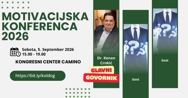 Pridružite se **Motivacijski konferenci 2026**, edinstvenemu dogodku, kjer boste našli navdih, praktične strategije in moč osebne rasti. Glavni govorec bo **Kenan Crnkić**, ki bo z vami delil svoje izkušnje, ključne uvide in motivacijske tehnike za dosego ciljev. Poleg njega bodo nastopili še nektaeri priznani gostje, ki vas bodo opremili z idejami za uspeh, pogum in premagovanje izzivov.
